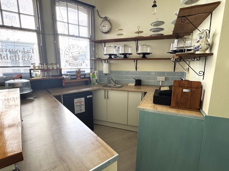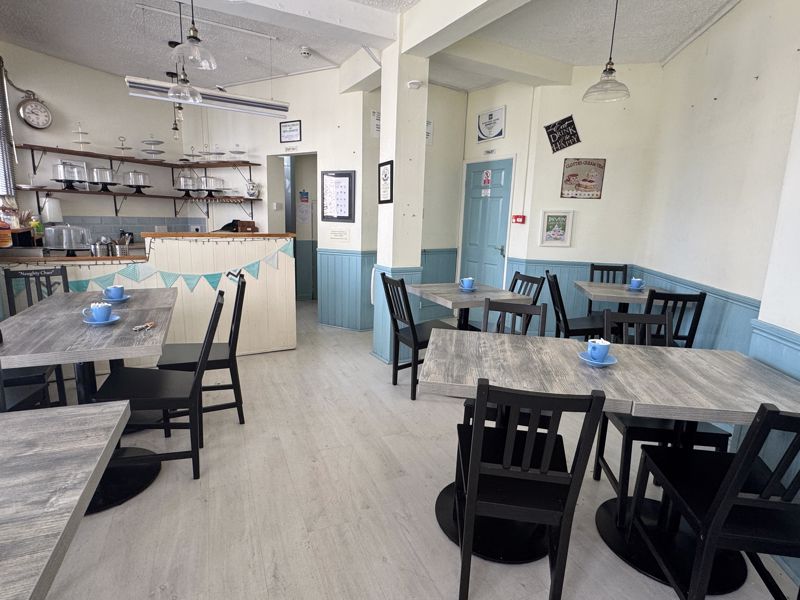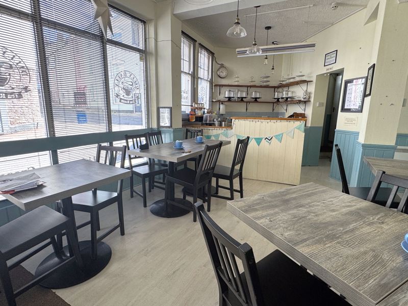 The café, previously let at £16,000 per annum, is offered with vacant possession and retains its premises licence for alcohol sales. The internal seating area accommodates approximately 16 covers and is complemented by a serving counter with integrated shelving, cupboards, and sink. A commercial kitchen lies beyond, fitted with electric equipment which is included in the sale. Ancillary space includes a customer WC and store, with access to the rear courtyard which could serve as either private outdoor space or additional customer seating. The side yard, accessed via a gate, offers practical storage or further potential for trade use.