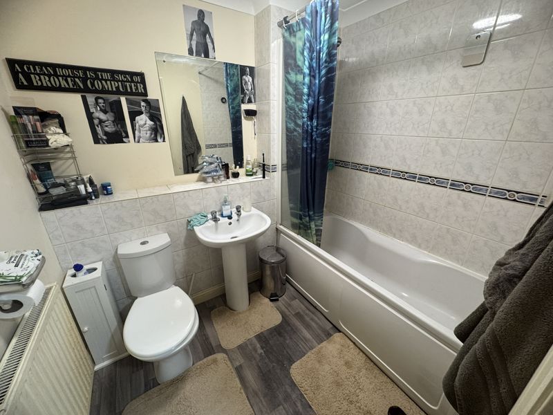 BATHROOM Panelled bath with tiled surround and overhead shower, pedestal wash hand basin, WC. Radiator with thermostat, extractor vent.