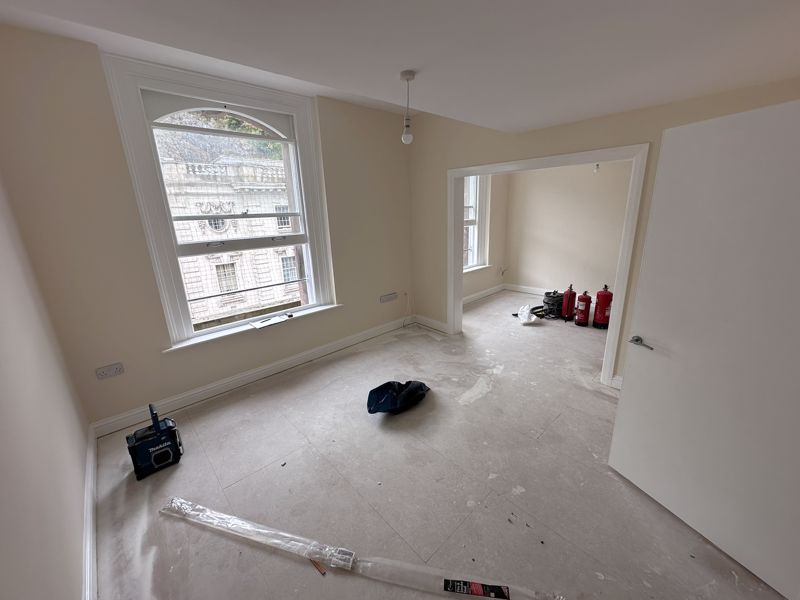 The offices have recently been refurbished and redecorated, creating a bright and welcoming environment. The layout includes three separate rooms and one larger, partially partitioned space, complemented by a fully equipped kitchen and a shower room. Each room features large sliding sash windows that flood the space with natural light, enhancing the overall atmosphere.