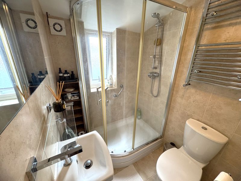 SHOWER ROOM Refurbished with floor to ceiling tiles, heated towel rail, corner shower, WC and wash hand basin with vanity unit.