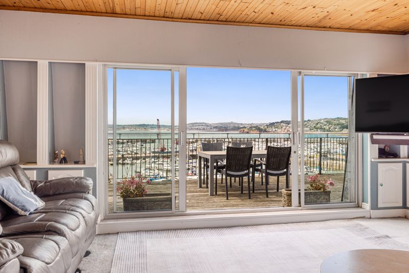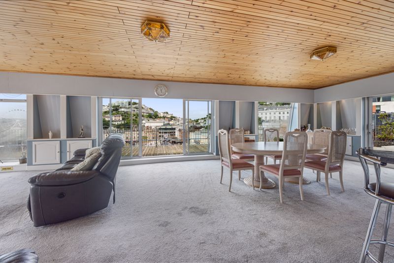 SITTING/DINING ROOM commands a triple aspect with three sets of French doors and picture windows linking the extensive terrace wrapping around three elevations encapsulating the unrivalled views over Torquay’s inner harbour, marina, and wider Tor Bay beyond, with the Strand and clock tower in the foreground, beautiful St Johns Church, stretching around to the Warberries and Lincombes hillsides.