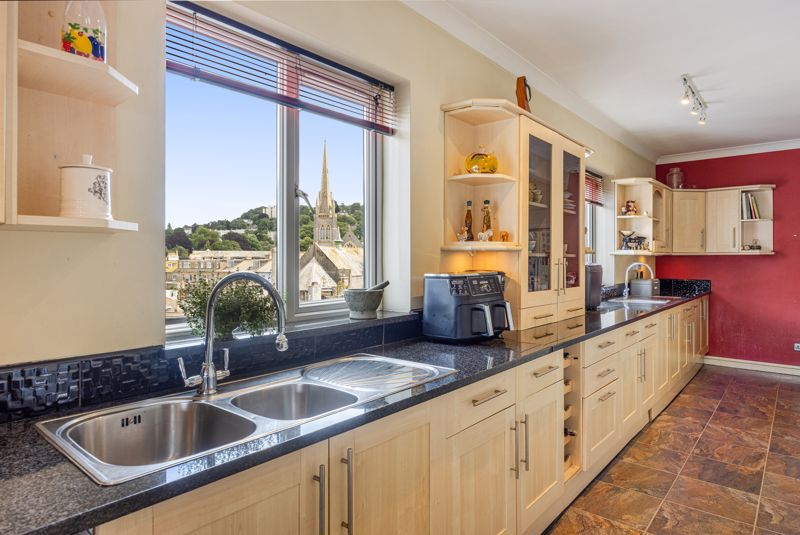 KITCHEN A solid granite breakfast bar separates the kitchen, with matching granite work tops, comprehensive range of units which includes an island with sink, and two further sinks for preparation. Three windows provide easterly light, and views towards the Lincombes and Warberries hillsides.